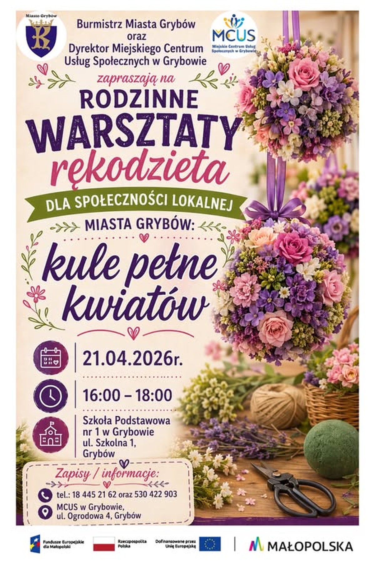 Kule pełne kwiatów – tak brzmi nazwa rodzinnych warsztatów rękodzieła, które odbędą się już w najbliższy wtorek (tj. 19 IV). Burmistrz Królewskie Miasto Grybów oraz dyrektor Miejskie Centrum Usług Społecznych w Grybowie zapraszają do Szkoły Podstawowej nr 1 w Grybowie na godzinę 16:00. Pora w pełni poczuć wiosnę!